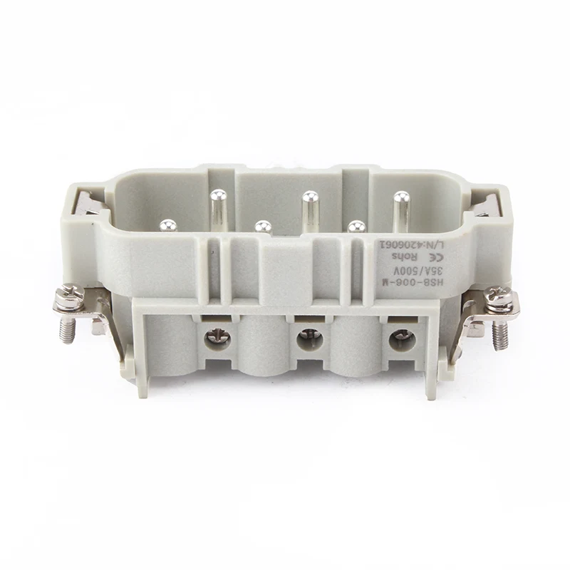 HSB-006-M HSB Didelės apkrovos jungtys veikia esant 35A srovei .35A 6 kontaktų įdėklas Didelės apkrovos jungtis yra 6 kontaktų arba dviguba 12 kontaktų, skirta susisiekti su laidais. Jis siūlomas skirtingoms darbo sąlygoms ir populiarus automatinėse pramonės šakose bei mašinų laidų jungtyse.