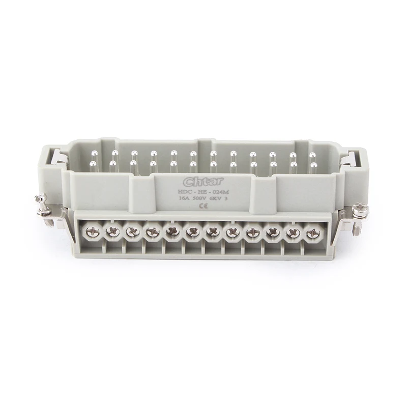 M/F 24 kontaktų įdėklos didelės apkrovos jungtys yra sunkiųjų jungčių HDC-HE-024 įdėtinės dalys. Jie pagaminti iš kompiuterio ir žalvario kaiščių. Įdėklos dalys ir aliuminio korpuso dalys surenkamos kaip visas sunkių jungčių rinkinys. Įdėklo dalys yra elektrinio prijungimo funkcija, o aliuminio korpusas yra apsaugotas įdėklų dalis. Jis turi IP65 apsaugą.
