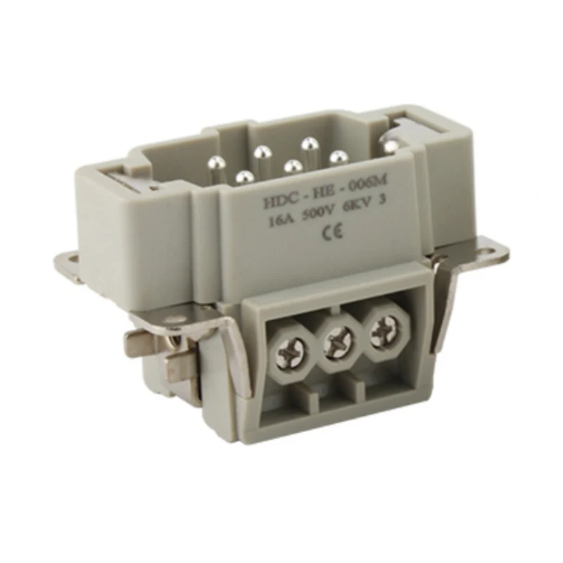 M/F 6 kontaktų įdėklo sunkiosios jungtys veikia esant 16A srovei. Tai yra 16 kontaktų, kad būtų galima susisiekti su laidais. Jis siūlomas skirtingoms darbo sąlygoms ir populiarus automatinėse pramonės šakose bei mašinų laidų jungtyse.
